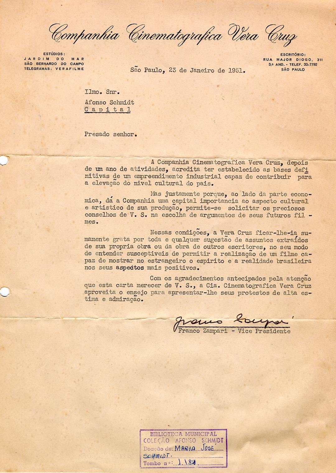 Carta da produtora e companhia de cinema Vera Cruz.