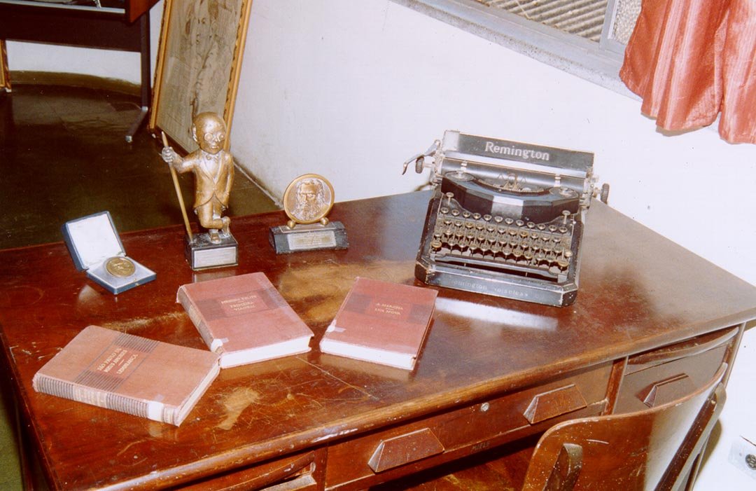 Mesa do escritório de Afonso Schmidt com o troféu Juca Pato.
